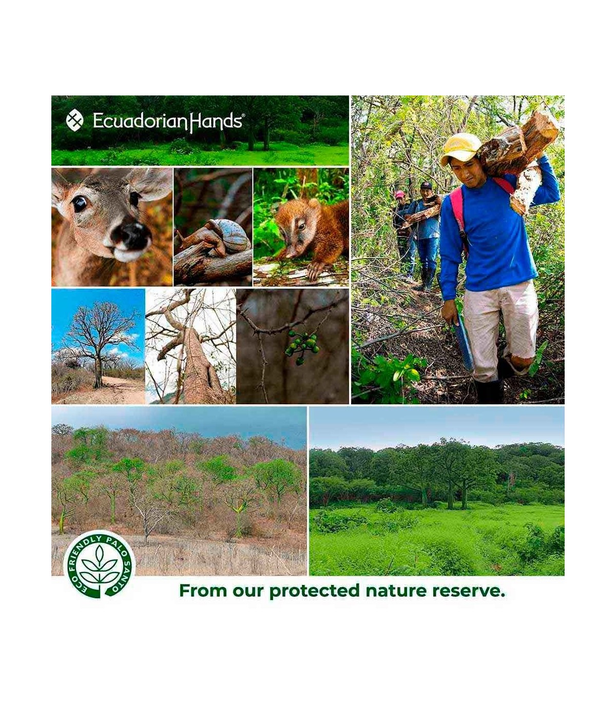 Our Palo Santo comes exclusively from a Protected Natural Reserve in Ecuador, declared by the Ecuadorian Ministry of the Environment. It is harvested only from naturally fallen trees, respecting the cycles of the dry forest and traditional practices.