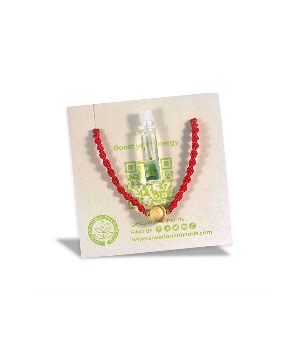 Pulsera roja buenas vibras Perla de Palo Santo + vial 1ml aceite esencial